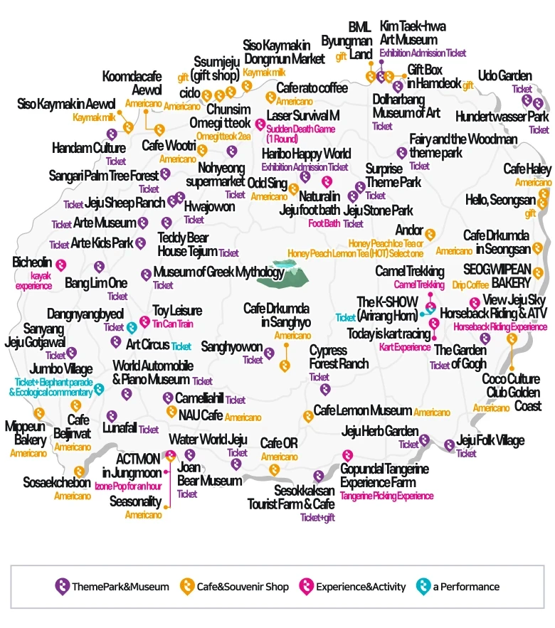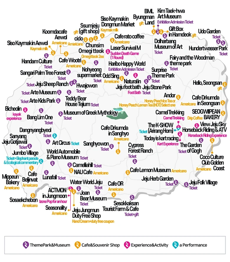 Travel categories available for Jeju Tour Pass: Tourist attractions, activities, cafes, souvenir shops, etc