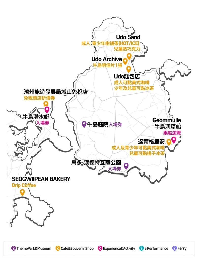 適用於牛島旅遊通票的旅行類別:旅遊景點、活動、咖啡店、紀念品商店等